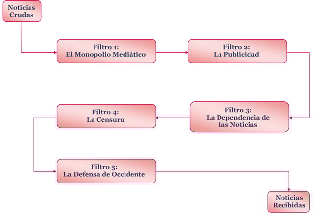 Filtro 3 – La Dependencia de la Información: Brindada por el gobierno, las empresas y los “expertos”. Las burocracias de los medios tienen afinidad con la del Estado y la de las empresas, y se basa en éstas para satisfacer su necesidad de un flujo continuo de noticias a bajo costo. Por otra parte, si uno duda de la “versión oficial”, siempre puede consultar a los expertos. Desde luego, éstos pueden ser ganados para su causa por las grandes empresas o por los intereses oficiales financiándolos, auspiciándolos o incluyéndolos en su personal.