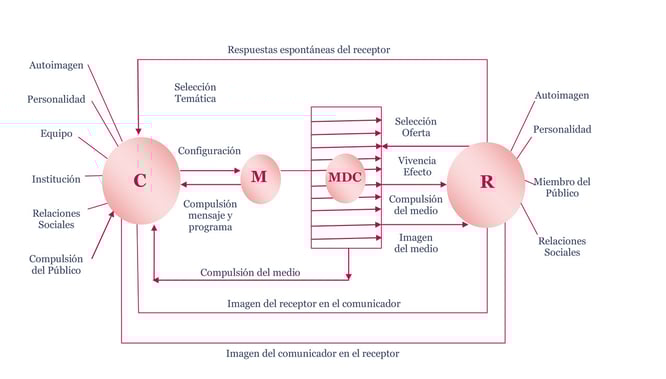 Debe entenderse el campo de relaciones de la comunicación como un sistema dinámico complicado de dependencias e interdependencias de los factores participantes. [...] A diferencia de la mayoría de modelos esquemáticos similares, fundamentamos, por una parte y de antemano, nuestro esquema en datos específicos de la comunicación social mientras que por otra se integran aquí varios momentos importantes, indispensables para la comprensión de la comunicación social pero que hasta la presente casi no han sido tomados en cuenta por la investigación o no lo han sido del todo. A más de ello, este esquema deberá ajustarse, en mayor grado que los que le preceden, al entrelazamiento múltiple de los factores de campo (Maletzke, G., 1992, p. 52).